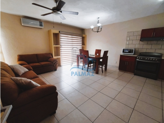El departamento está completamente amueblado se encuentra en segunda planta, cuenta con sala con aire acondicionado tipo mini Split y pantalla plana, cocina equipada con refrigerador, estufa, campana y horno de microondas, comedor para 4 personas, 1 baño, 1 recámara con closet y su aire acondicionado tipo mini Split, cuarto de lavado, con lavadora, secadora y boiler.
