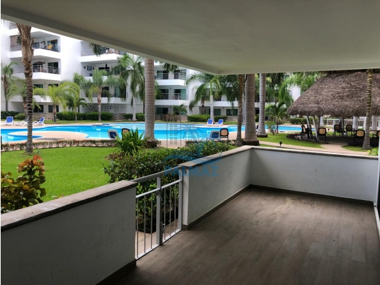El departamento se ubica frente a Marina de Yates Mazatlán, en planta baja con acceso a áreas comunes del condominio, a un par de minutos de Zona Dorada, Plaza Galerías y playas.