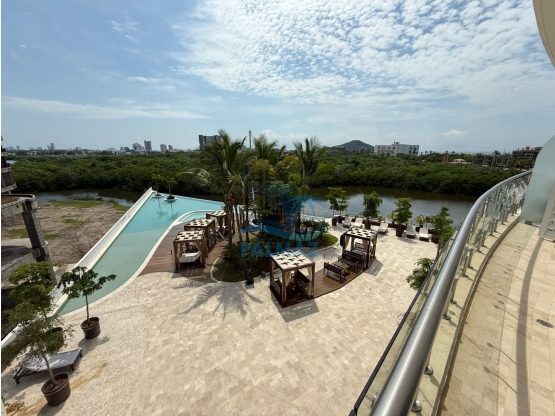 El condominio está totalmente amueblado, cuenta con una vista panorámica de la Marina Mazatlán, balcón, amplia sala, amplio comedor, cocina integral equipada con barra desayunadora, estufa con campana, toda estas áreas cuentan con un A/A tipo minisplit para controlar el clima.